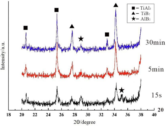 The reactions of preparing Al–Ti–B Master Alloy by the Ti-sponge route are shown in Formulas (4) and (5). Reaction (4) occurred spontaneously at the temperature range of 800–900 °C [19]. The mass ratio of Ti to B is 4.43:1 in reaction (4). The mass ratio of Ti/B added to the reaction is 5:1. Therefore, reaction (5) also occurred. Figure 5 shows the X ray diffraction pattern of the Al–Ti–B Master Alloy prepared by the Ti-sponge route with reaction times of 15 S, 300 S, and 1800 S. The diffraction peaks of the TiB2 were observed at 15 S. AlB2 and TiB2 existed in the matrix simultaneously at 15 S (consistent with Formula (5)) for TiB2 diffraction peaks broadening.