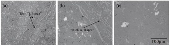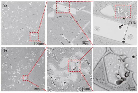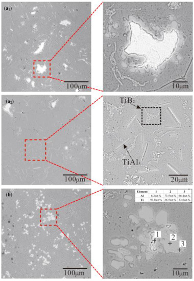 There are both blocky and rod-shaped TiAl3 in Figure 8. Further, it was found that TiB2 was embedded in blocky TiAl3 (Figure 7b). The hexagonal holes appeared in the rod-shaped TiAl3 and were eroded by pure Al (Figure 7a). If B was added into the Al–Ti alloy melt containing TiAl3, then B could form TiB2 on the TiAl3 and cause the TiAl3 to break or even dissolve [29]. The resulting TiB2 will be agglomerated between the TiAl3 and Al matrix. The reaction equation is as follows: