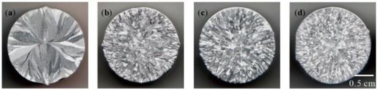 The refining effect of different Al–Ti–B Master Alloy on pure aluminum: (a) Pure aluminum; (b) 30% Ti-sponge route; (c) Ti-sponge route; (d) halide salt route.