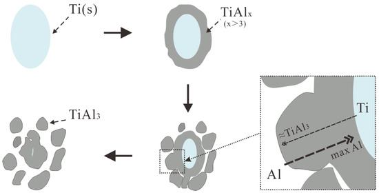 The nucleation of TiAl3 mainly depends on the mutual diffusion of Al and Ti for the Ti-sponge route. This diffusion process makes TiAlx form around the pure Ti particles first, as shown in Figure 6b. As diffusion progresses, the external TiAlx is separated into single TiAl3, but the concentration of internal Ti remains high (Figure 6a1). Finally, the TiAlx completely converted into separated TiAl3 after 300 S reaction at 800 °C (Figure 6b). This mechanism is called the Ti–TiAlx mechanism for the Ti-sponge route, as shown in Figure 9. Sunda [30] proposed that Ti–Al’s interdiffusion coefficient (D) is a function of composition and temperature; D increases with increasing temperature when the composition is constant. The diffusion activation energy of aluminum (Q) is different in different phases, but Q is substantially constant and independent of the concentration. We have the following order: Q[TiAl3] > Q[TiAl] > Q[α-Ti(Al)] > Q[β-Ti(Al)]. Obviously, the diffusion coefficient of Al in Ti3Al is smaller than that in Ti particles. Therefore, Al enriched on the Ti particle’s surface passed through the TiAl3 layer (Figure 9) resulting in a high concentration of Al surrounding the surface of the Ti particles. Thus, TiAlx is constantly formed and eventually converted into separate TiAl3.