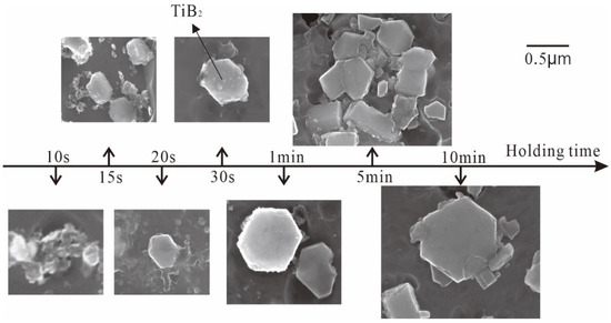 The TiB2 was an irregular small particle at the initial stage of the reaction (10 S and 15 S). Regular hexagonal TiB2 particles appeared with longer reaction times to 20 S and 30 S, and the size of TiB2 was about 0.5 μm. At 60 S, the size of TiB2 particle continued to increase. At 5 min, some TiB2 collided together and cracks appeared along the junction of particles. At a reaction time of 10 min, the size of TiB2 particles reached 1.5 μm and there were a lot of lug boss’ around the TiB2 particles. According to the reaction (7), the filamentous AlB2 (corresponding to (Tix, Al1−x)By in Figure 1a) was more likely to be destroyed when it was transformed into TiB2 [33]. Therefore, TiB2 was more easily crushed with increasing reaction time.