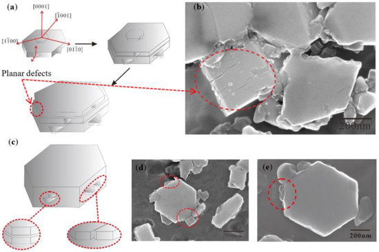 Schematic diagram and microstructure of possible defects in the earlier and later growth stage of TiB2 for the Al–Ti–B Master Alloy prepared by the halide salt route: (a) earlier TiB2 crystal growth model; (b) earlier actual growth of TiB2; (c) later TiB2 crystal growth model; (d,e) later actual growth of TiB2.