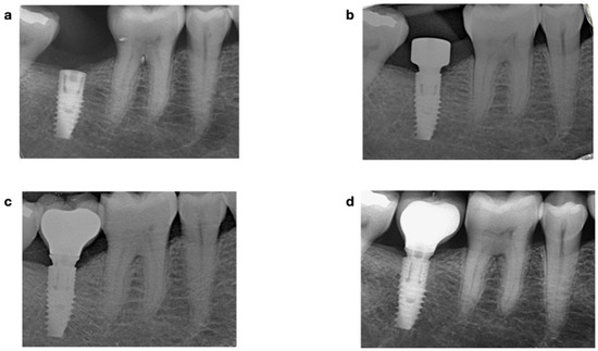 Periapical radiograph-parallel technique for MBL analysis at the 1-year follow-up. (a) 2-stage implant placement; (b) 2-stage surgery 4 months after implant placement; (c) CAD-CAM metallo-ceramic crown cemented to a 0.5 mm anti-rotatory Ti-base abutment at the 6-month follow-up; and (d) at the 1-year follow-up.