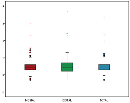 Box plot of the mean mesial, distal, and mean of both sites for MBL at 1-year follow-up. The box contains 50% of the cases, the median is the horizontal line that divides it. The upper and lower edges of the box correspond to the 1st and 3rd quartiles that represent 25% and 75% of the sampling, respectively. Whiskers in the box plots extend to the acceptable range of values (above which are the outliers (circles) and the extreme (asterisks) cases, respectively).