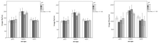 Figure 1 depicts the surface roughness parameters for all three wire types after immersion in artificial saliva with four different pH values; the RhNiTi showed higher roughness values than the other two wires, but there were no significant differences between the values for the various saliva pH values.