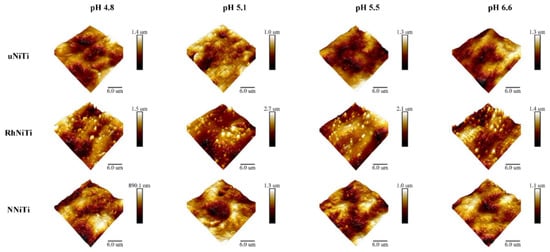 Typical AFM findings from every experimental group (horizontal rows: uncoated NiTi (uNiTi), rhodium-coated NiTi (RhNiTi), and nitrified NiTi (NNiTi) wires), after immersion in artificial saliva with four different pH values (vertical columns), presented as a three-dimensional chart.