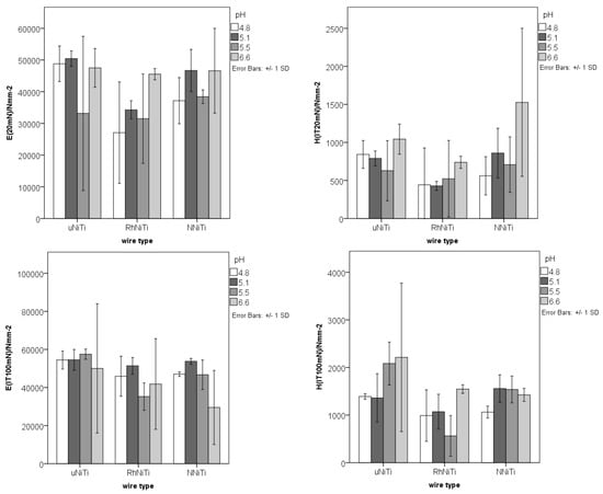 The obtained values of HIT and EIT (Figure 3) showed a certain amount of variety among the measurements for all the analyzed wires and pH conditions. Higher values were obtained using the larger force during testing (100 mN versus 20 mN), as the nanoindentation probe entered deeper into the tested material, past the surface irregularities. As in the case of surface roughness, a rather large dispersion of the nanoindentation values was observed.