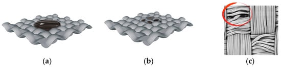 Levels of interaction between contamination and woven fabric. (a) Surface adhesion of contamination on the fabric; (b) liquid contamination penetration into the fabric structure; (c) liquid contamination penetration into the structure of the yarn.