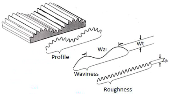 Topographic properties of surfaces are characterized by surface roughness and waviness parameters [,,]. In fabrics, the typical topography is expressed by the regular repetition of waves in the vertical, horizontal or off-axis directions which result from a specific structure. The structure of the fabric is defined by the construction parameters of the yarn, the weave (type of weave and the size of the weave unit) and the yarn density in the warp and weft directions. However, to establish the relationship between fabric design parameters and the tendency towards contamination, it is necessary to analyse the fabric’s surface properties at the meso level. The topographic properties of woven fabrics at this level are the result of the weave, structural properties, and the type of yarn. The parameters that describe the topographic characteristics of the material are reflected in the characteristics of the waviness and roughness, Figure 2 [].