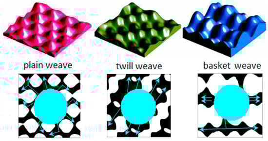 In the research of Calvimontes et al. [], the correlation between the topographic parameters of woven fabrics and the velocity and direction of liquid droplets’ movement on the material was investigated. Topographical differences were found between samples woven into plain, twill, and basket weaves. In woven fabrics with the highest values of the waviness, the spread of liquid droplets was the slowest. In twill weave fabrics structured as so-called “channels” with “islands”, the droplet speed was higher than in the plain weave sample. In the basket weave samples, the topographic structure has continuous “channels” (without “islands”) and the rate of droplet distribution was the highest. Illustrations of these weaves are presented in Figure 3. Analogously, liquid contaminations will be distributed more rapidly across fabrics with higher weave factor values (loose weaves).