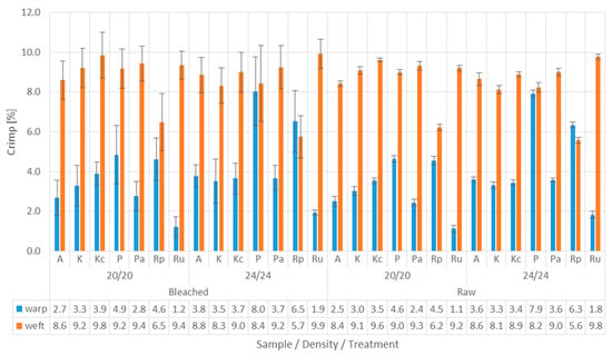The graph in Figure 5 shows that the warp crimp values are lower than the weft crimp values, which is in line with fundamental textile theory. Due to the shrinkage of the fabrics in the bleaching process, the crimp had changed slightly, which affected the topographic structure of the woven samples’ surface and consequently the behaviour of contamination drops.