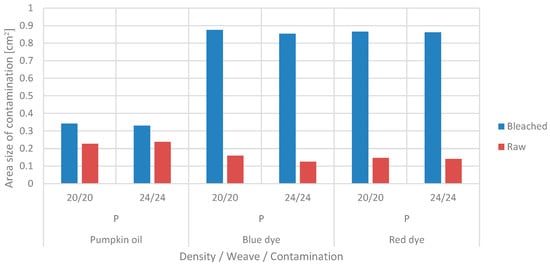 The surface area values of the red and blue dyes on the bleached samples were the highest. The contamination surface area of these dye solutions on the raw sample was significantly lower. The surface area of pumpkin oil was also larger in the case of the bleached sample. In addition, the differences in the areas of contamination with pumpkin oil in the raw and bleached samples were significantly smaller than in the dyed ones.