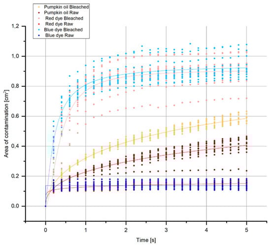 Figure 7 shows the distribution of the droplets in the first 5 s grouped by type of contamination and type of treatment, regardless of weave and density. Penetration and distribution of red and blue droplets were faster on the bleached samples than on the raw ones. The equilibrium state of the dye solution (stop in spreading) was achieved in all samples. Therefore, pumpkin oil was not balanced on all surfaces after the first 5 s. This may be explained by oil viscosity and hydrophobicity, which certainly slows down the spread.
