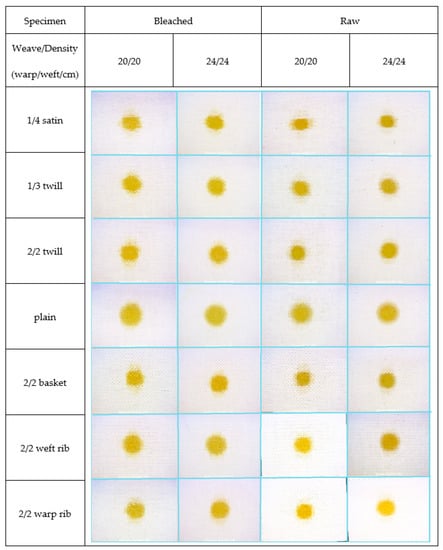 Fabric samples in the satin weave “absorbed” all types of contaminations exclusively by capillary action. In case of raw fabrics samples, the effect was more pronounced in the weft direction, while in bleached samples the absorbance was more pronounced in the warp direction. It should be emphasized that the woven fabric’s front side was dominated by the weft effect in a ratio of 4:1. Moreover, the surface of the red and blue dye contamination on bleached samples (circle) had a much larger radius compared to raw samples, which means that the contamination was first distributed by absorption into the fibre to a certain distance from the centre, after which it continued to move through the yarn by capillary action.