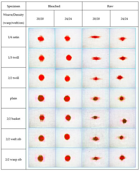 The contamination distribution on the surface of textile materials was determined by the speed and direction. While the speed of absorption was largely determined by the degree of finishing of the fabric and the type of contamination, the direction of movement of the contamination depended on the hydrophilicity of the fabric and its constructional and structural characteristics. It is important to note that the levels of contamination distribution described in the theoretical part of this article are ideal cases with clear examples. In the experiment, a combination of two or even three levels of distribution occurred in most contaminations. In the case of diagonally structured fabrics of lower hydrophilic character, the distribution of the contamination was intense in the directions of the diagonals, and the final form of contamination had an elliptical, twisted shape. A pronounced capillary distribution through the yarn (threads) of the warp and weft was present in the raw samples contaminated with dyestuff. Therefore, greater dye penetration was taken over by a less tense system with higher crimp values (mostly weft). The distribution of fibre-to-fibre transfer movements with consequent isotropic contamination propagation occurred in cases of strong affinity of the textile material to the type of contamination, i.e., in the following cases: bleached fabrics—dyestuff (red and blue) and raw fabrics—pumpkin oil.