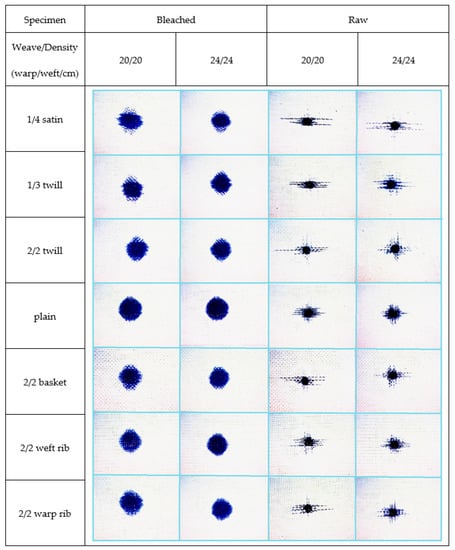 When applying blue dye to raw fabrics, in all samples except the satin, the distribution of contamination was capillary through the yarn. In 20/20 density samples the distribution was more pronounced in the weft direction, while in 24/24 density samples the distribution was equal in both directions.