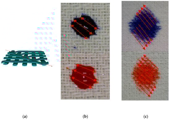 Figure 11b,c shows the diagonal migration of dye droplets on a bleached twill 1/3 fabric, density 24/24. The left figure b shows a drop at the very beginning of the distribution, where it can be seen that the drop took an elliptical shape, rotated by 45°. The right figure c shows the sample after the contamination spreading ended.