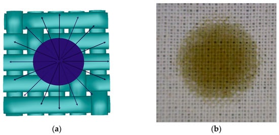 Distribution of drops with a uniform tendency to spread from the centre outwards: (a) 3D simulation; (b) Penetration of a pumpkin oil drop into the fibre and transfer to adjacent fibres—proper distribution, equal in all directions (bleached fabric in plain weave, density 24/24).