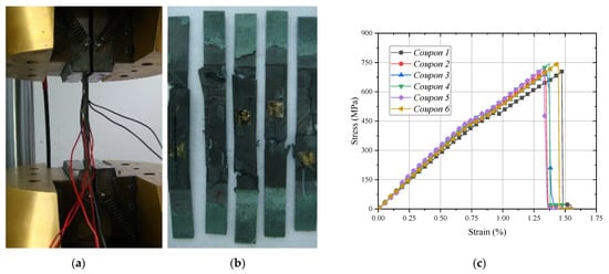 According to the ASTM D 3039-2008 standard, the quasi-static tensile tests were performed on the MTS-810 testing system (Mechanical Testing & Simulation, Eden Prairie, MN, USA) in Figure 1a. The averaged surface strain at the middle position of each specimen was recorded with a loading rate of 2 mm/min. Each damage morphology is shown in Figure 1b and its damage procedure can be illustrated obviously from the tensile stress–strain curve of each specimen in Figure 1c. In the loading process, the micro-scale cracks in the inter/intra-laminar area were firstly initiated at a strain of . Then the matrix impregnated fibers become split, peel or pull out. The specimen finally fractured at with the failure modes of delamination being between layer-to-layer debonding and brittle fiber breakage. The initial averaged tensile modulus and ultimate strength are about and .