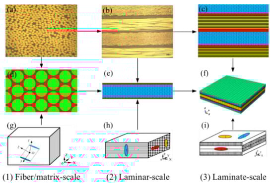 Due to the characteristics of inherent anisotropy and heterogeneity, the damage mechanisms of composites are complex occurring at multi-scale levels, such as matrix cracking, fiber breakage, delamination and debonding, etc., [1] which make efficient and accurate numerical predictions play an increasingly important role in their design and application in various industries [2]. In order to clarify the inherent progressive failure processes of laminated composites from a fiber-matrix level, lamina level, laminate, and component level, a multi-scale damage analysis incorporating the physics of the above-mentioned failure may provide an accurate prediction of failure strength and mechanisms [3,4,5]. Recently, the use of the micro-meso-macro concept in multiscale analysis is widely performed by transferring mechanical parameters and damage details from one scale to the next level.