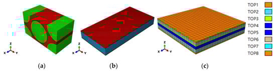 The adapted FE (finite element) models are displayed in Figure 3. In the FE models, the x direction is the fiber direction in the micro/meso-FE models and the fiber/loading direction in the macro-FE model. The y direction is the in-plane transverse direction. The z direction is the thickness direction. The macro-FE model in Figure 3c was layered from Top 1 to Top 8 corresponding with the sequence of [+45/−45/0/90/90/0/−45/+45]. The C3D8R element was adopted in the micro-RVE with 25,040 elements, the meso-RVE with 213,750 elements, the macro-RVE with 6400 elements packed two elements in the thickness layer. In the multi-RVEs analysis, the periodic boundary conditions (PBCs) by master-slave node technology, the displacement loadings application and homogenized strategy from micro-FE model to meso-FE model, macro-FE model could be referenced to the detailed statements [29,38].