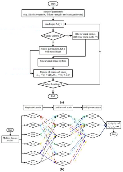 Damage and post-damage flowchart of user-defined material subroutines (UMATs): (a) UMAT flow chart; (b) Numerical damage path for different smear cracks.