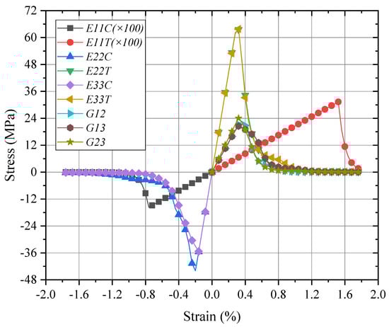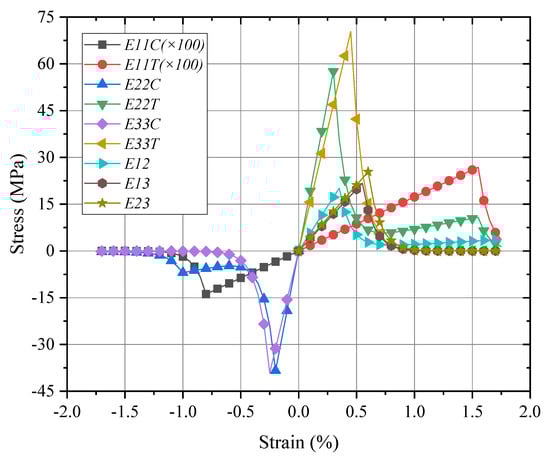 For the fiber-rich zone in the middle layer of the meso-RVE as shown in Figure 2e,h, the transversely isotropic post-damage model has been compiled in the UMAT subroutine with single, double and complex smear crack modes. For a single smear crack in the fiber-reinforced zone, such as the fiber fracture and matrix crack. For example, when the fiber fractured in the fiber direction with crack 1 in Figure 2h, its transversely isotropic post-damage constitutive model for the fiber-rich zone (in Figure 2e) can be given in Equation (6) [27].