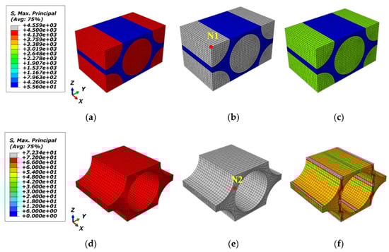 At the initial loading stage, the micro-RVE features the same response for tensile and compressive loadings in the same loading direction. Upon further loading, the cracks in fiber/resin are initiated once any of the predefined criteria in UMATs are reached under tensile, compressive or shear displacement loading. For the fiber-directional tensile loading case (E11T), regarding a fiber failure strength of and matrix failure strength of (in Table 1), the fiber area where the maximum principal stress exceeded the above failure threshold is changed into the grey zone as shown in Figure 6b,e. The further details are revealed with two local nodes selected as N1 node in Figure 5 and N2 node in Figure 6e.