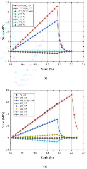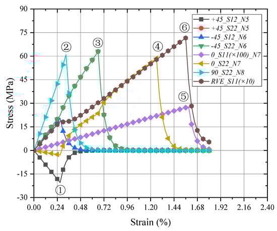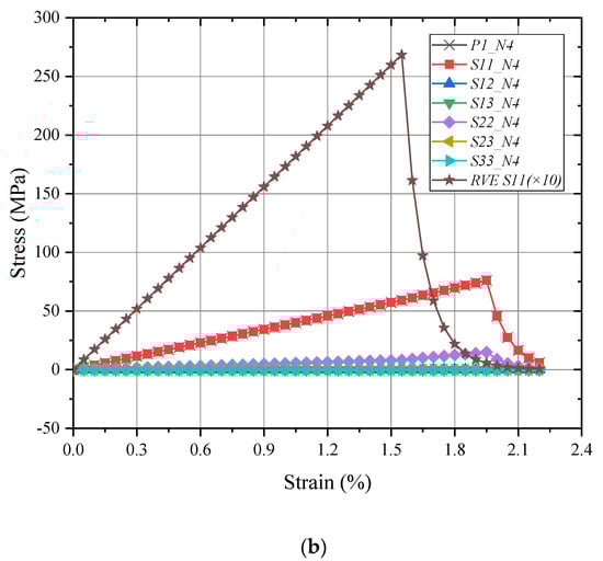 For a detailed analysis in the meso-RVE, its local responses (N3 in fiber-rich zone and N4 in resin layer) are selected in Figure 9 and Figure 10. In the longitudinal loading process, local damage is initiated when the x direction stress component () reached the ranges of failure strengths listed in Table 2. Then the meso-RVE loses the ability to undertake continuous loading in integrity due to the fiber breakage (nearby ) of fiber-rich layer, as shown in Figure 7a, and matrix cracking (nearby ), as shown in Figure 6b.