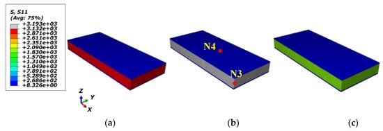 The mechanical responses of the macro-RVE in normal, shear directions, respectively, are provided in Figure 11. In macro-RVE’s analysis, the laminar layer failure criteria, such as the tensile, compressive and shear failure strengths of meso-RVE, as shown in Table 3, are incorporated into the macro-RVE model independently. For example, under x direction tensile loading (E11T) with its damage evolution as shown in Figure 12, the tensile behaviors show linear responses at the initial stage () with a tensile modulus of . Nearby, the 0.3% stage of strain, the damaged zone is initiated possibly as delamination or matrix crack, the tensile modulus slightly reduces to . With further loadings, the macro-RVE continues to undertake the higher load in integrity and fracture due to fiber split and breaks at about . Compared to the tested results of , , the numerical ones are with , ). The major fracture initiation and evolution, such as S11 was displayed in Figure 12. The 0 layers undertake the essential loading before their ultimate failure, which determinates its ultimate strengths in integrity as shown in Figure 12c. Once the failure strengths threshold in the 11 direction is satisfied as listed in Table 3, the smear crack with its surface perpendicular to the fiber direction (in Figure 2i) would be initiated numerically and the fiber fractured thoroughly, such as the white area in Figure 12c.