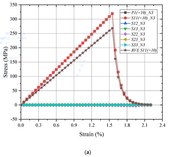 Due to the essential distinction in the structure of the real fiber-packed layer in the laminate, as shown in Figure 3b, a resin layer between each fiber layer makes the meso-RVE with different behavior characteristics in the transverse sections as shown in Figure 8 (e.g., and ). The meso-RVE slightly features the excellent behavior in the thickness direction than in the other transverse directions. Comparatively, the meso-RVE in fiber direction has the higher modulus and failure strengths, such as The further numerical results are referenced in Table 3.