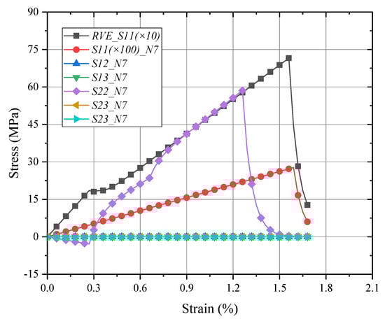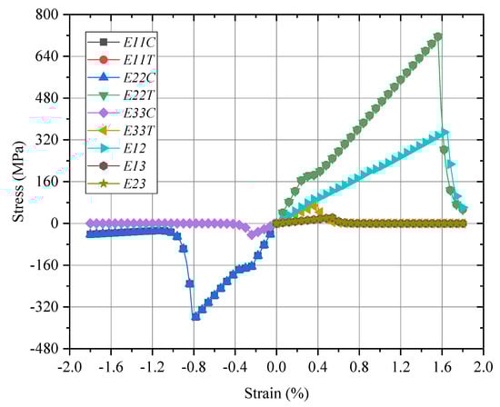 Based on the properties of matrix and fiber in Table 1, the mechanical responses with failure strengths of micro-RVE in Figure 3a are predicted under six independent pure normal/shear loadings as shown in Figure 5 (Note: 1-fiber direction and 2, 3-transverse directions. ET, EC and G identify tensile, compressive elongation and shear loading cases, respectively. E11T × 100 means its value magnified by 100 times). The micro-RVE behaves transversely isotropic with a much higher tensile modulus along the fiber direction (E11 = 206.0 GPa) than transversely (E22 = 22.2 GPa, E33 = 22.1 GPa). The micro-RVE has the higher ultimate strength in the fiber direction () than transversely and ). For each loading case, such as x-directional tensile loading (E11T), once the fiber fractured damage initiates at about , the micro-RVE behaves with a peak value and then degrades gradually quickly and loses its ability to endure further loadings in integrity. The mechanical homogenized parameters of micro-RVE are calculated and listed in Table 2.