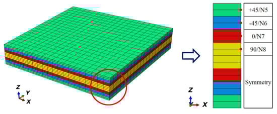 For the interior structure in the experimental specimen as shown in Figure 2a,b, the Multi-scale RVEs were established, respectively, based on the principle of equivalent fiber volume and the intra/inter-phase fiber layer construction as displayed in Figure 2d–f. The interior fiber-packed patterns in each layer were distributed in Figure 2a and the corresponding interfacial phase was shown in Figure 2b. The paralleled fiber-rich layers were packed periodically in thickness with an inter-laminar zone filled with resin. Firstly, the multi-layer meso-RVE (in Figure 2c) was built according to the periodic array (eight layers) and real size (1.48 mm) of the angle-ply laminate as shown in Figure 2b. The thickness size of one layer in Figure 2e was divided by about 0.185 mm (relatively, 0.155 mm for fiber-rich layer and 0.03 mm for pure resin layer). The macroscale RVE of the angle-ply laminate was constructed with a stacking sequence of [+45/−45/0/90]s of eight layers in Figure 2f. The sizes of macroscale RVE and mesoscale RVE in-plane were, respectively, adapted with 8 mm × 8 mm (x and y directions) × 1.48 mm (in the thickness direction) and 0.75 mm × 1.5 mm (x and y directions) × 0.185 mm (in the thickness direction). Secondly, the micro-RVE with a hexagonal fiber-packed pattern in the interior zone of each layer was obtained based on the concept of fiber volume between experimental and numerical models. The equivalent fiber volume fraction in the micro-RVE was calculated as 68.39% based on the ratio of total fiber volume in angle-ply laminate (57.3%) to the matrix impregnated fiber-rich zone volume fraction (83.78%) in the meso-RVE. Using a hexagonal fiber-packed distribution, the size of micro-RVE was determined with 17.971 mm (in length) × 12.71 mm (in width) × 10.0 mm (in fiber direction) assuming that the radius of fiber was 5 mm (R = 5 mm) as shown in Figure 2d.