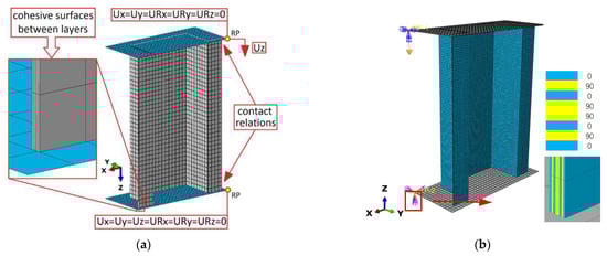 Virtual test of FE models with load and boundary conditions: (a) 2D model with shell element (SC8R) and Cohesive element [31]; (b) 3D model with solid element (C3D8R).