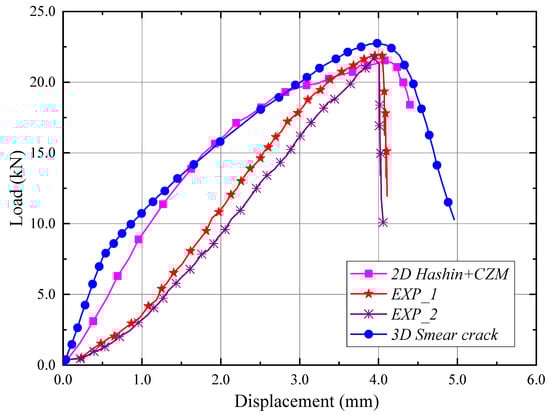 Compared to previous experimental and FEA curves, the current numerically obtained curve shows more “stiffness” in the initial range as shown in Figure 18, which is caused by the fact that the numerical models use the assumption of perfect construction, not affected by manufacturing imperfections. In addition, the difference in the initial range of previous and current numerical testing is due to with and without the effect of the interface phase between the 0/90 layers. Nevertheless, a very high agreement of results is obtained, especially in the context of limit loads.