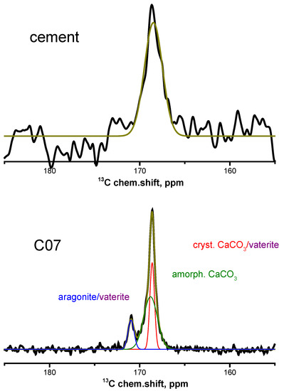 The 13C NMR spectrum of the anhydrated cement (Figure 1 (top)) shows a single broad asymmetric line at a chemical shift of about 168.7 ppm. Most likely, this line originates from amorphous calcium carbonate and, possibly, small amounts of calcite and dolomite, which are contained in cement, according to the phase composition obtained from the XRPD analysis (Table 1). An effort to perform component deconvolution in this spectrum was not attempted, because its line shape is quite broad and the 13C chemical shifts of the carbonate compounds fall close to each other [14]. The 13C NMR spectra obtained at different ages of cement hydration show two (except for CAA and CSA at 1 d) clearly distinguished peaks (Figure 1 (bottom) is an example of the 13C NMR spectrum of the sample C07; the other spectra are provided in Supplementary Figures S1a–S3a). Moreover, the peak at about 168.5 ppm consists of unresolved narrow and broad signals; the deconvolution into two peaks is justified in Supplementary Figure S1c,d. We note, however, that the precision of the deconvolution of unresolved signals might suffer from larger errors and a certain degree of caution should be exercised when analyzing these results. The position of the signal at about 171 ppm remains virtually unchanged over time. However, the narrow component of the signal at 168.5 ppm was slightly shifted to the weak field at the initial stage of hydration, and the broad component was shifted to the strong field throughout the entire hydration period, with the exception of the CSA sample, for which this component was shifted, on the contrary, to the weak field. The signals mentioned are contributed also by the presence of calcium monocarboaluminate hydrate, forming during the hydration process. The time dependences of the 13C chemical shift values are shown in Supplementary Figures S1b–S3b in Supporting Information.