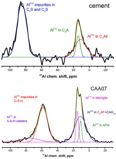 The 27Al NMR spectrum of the anhydrated cement (Figure 2 (top)) shows two isotropic signals. The signal at 85 ppm corresponds to aluminum atoms in tetrahedral environment of oxygen atoms Al(IV), which are in the form of impurities in alite and belite [18]. The signal at about 10 ppm corresponds to aluminum atoms in octahedral environment of oxygen atoms Al(VI). This signal consists of two spectral components: the narrow component at about 15 ppm corresponds to aluminum atoms in Ca3Al2O6 (C3A), and the broad one at about 10 ppm to C4AF [18].