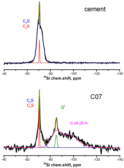 The 29Si NMR spectrum of the anhydrated cement (Figure 3 (top)) shows a single signal, which is superposition of a narrow line at about −70.6 ppm from silicon atoms in the structure of belite and a broad asymmetric line in the range from −65 to −75 ppm, which corresponds to silicon atoms in the structure of alite [20] that are located in various local environments.