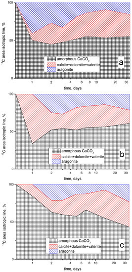 Figure 4 shows the time dependences of the relative integrated intensities of the 13C NMR signals for all three studied samples. It can be seen that the intensities of the lines corresponding to amorphous calcium carbonate sharply decrease at the initial stage of the hydration process for C and CAA samples, and then a slight increase is observed. For the CSA sample, a gradual decrease in the relative proportion of amorphous calcium carbonate is observed. The proportion of calcite increases for all the samples, while that of aragonite decreases, as is especially noticeable for C sample. However, at the end of the studied hydration period (15–34 days), the relative content of calcite and aragonite essentially stabilizes and for CAA sample even slightly reverses. It should be noted that a significant amount of aragonite is observed on the first day of hydration only for C sample.