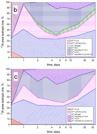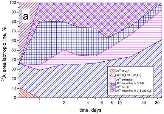 Figure 5 illustrates the time dependences of the relative integrated intensities of the 27Al NMR signals for all three studied samples. Considering the observed changes in the intensities of the aforementioned spectral components, it can be concluded that, after the initial dissolution of the aluminate phases of the cement used, a large amount of aluminate hydrate forms, whose quantity gradually decreases. Then the amount of various compounds in the form of C–S–H, A–S–H or C–(A–)S–H gels grows in volume, further gradually decreasing. Finally, a gradual increase in the amount of various calcium hydroaluminates and ettringite is observed.