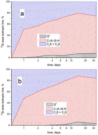At the later stages of hydration, a narrow line at about −86 ppm appeared in the spectra. This line corresponds to silicon atoms in Q2 structural elements of the cement paste, in paired (Q2P) and/or bridged (Q2b)silicon tetrahedra in silicate chains, which form the bulk structure of the resulting cement paste [22].