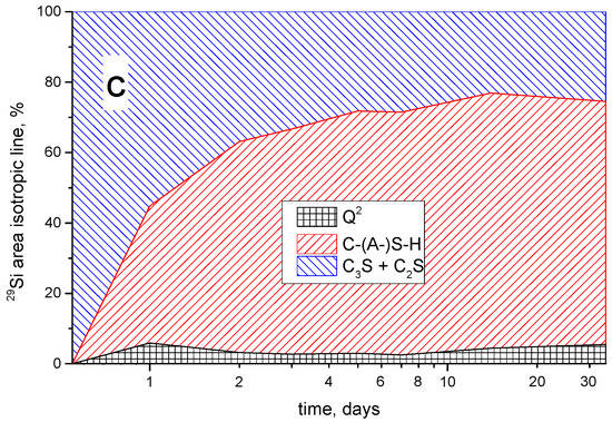 Figure 6 illustrates the time dependences of the relative integrated intensities of the 29Si NMR signals for all the three studied samples. When analyzing the change in the relative integrated intensities of the observed spectral components during hydration, we observed that the mass fraction of the silicate-containing clinker phases gradually decreases for all samples, while the mass fraction of the C–(A–)S–H phase increases proportionally, as well as the fraction of paired Q2 terahedra. It should be noted that the Q2 tetrahedra resolved in the spectrum appear on the first day for the CSA sample, on the second day for the C sample, and only on the third day for the CAA sample. Moreover, for the CAA sample, the spectral component, which is visually distinguishable from the baseline and is characteristic for Q3 and Q4 structural elements, also appears only on the second day of hydration.