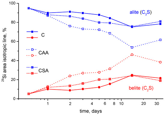 It should be noted that, during cement hydration, a relative redistribution of the amounts of alite and belite occurs (Figure 7). For all the pastes, an increase in the relative content of belite is observed that is much larger for the CAA sample as compared to the other two.
