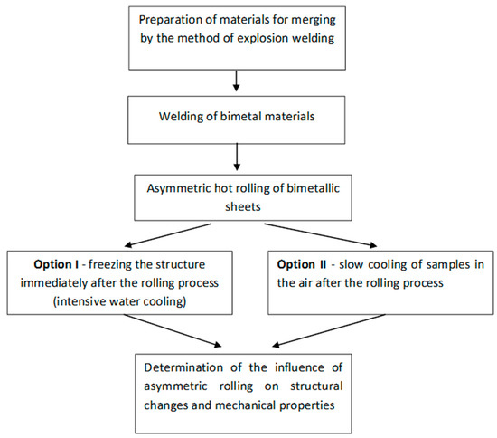 Nowadays, bimetallic materials have become more and more popular. This is caused mainly due to the need to improve the functional parameters of constructions (for example, in transport, lighter bodied cars are now standard) [1,2]. However, cars are not only the main field of interest for constructors using bimetals. Those materials are also present in power plants, shipbuilding, architecture, chemistry, and food productions [3,4,5]. There are many different possible technologies that can be used for both joining and final shaping. One of them is the rolling process. It consists in changing the shape of plastically processed materials as a result of the interaction of external forces. Both the geometrical dimensions of the rolled sheet metal and its internal structure change [6,7,8]. Metals and their alloys intended for further processing should be marked by a high plasticity, since hard or brittle materials fracture and get damaged under the influence of the applied pressure. The properties, which are responsible for the occurrence of hardening or its absence, have a decisive influence on the behavior of metals subjected to rolling [9,10,11]. The impact of the rolling process on structural changes of homogeneous sheet metals is relatively well-described in the literature [12,13,14]. However, the matter becomes more complicated in the case of bimetallic sheet metal rolling [15,16,17], where it is even imposed to use an asymmetric rolling process as a method of reducing the curvature of the two-layer band. Bimetal materials have separate properties that may cause differences in the course of the ongoing structural changes [18,19,20]. Based on the literature [19,20,21] and according to the authors of the publication, these changes can be presented according to the diagram (Figure 1). It was assumed that rolling is performed for optimal process conditions (i.e., ensuring obtaining a straight sheet metal, after leaving the rolling gap, and the evenest distribution of the total deformation into the layers of the bimetallic band) [22,23,24]. The preliminary assumptions made before the tests assumed that the introduced asymmetry of the circumferential rate of the work rolls would make it possible to obtain both a product with the desirable geometry and favorable mechanical properties of bimetallic materials. Depending on the type of material and deformation parameters, the effects of deformation strengthening can be removed by dynamic or static healing and (static, dynamic, and metadynamic) recrystallization [25,26,27]. During the rolling process, the phenomenon of dynamic recrystallization or dynamic recovery occurs during deformation [28,29,30,31,32].