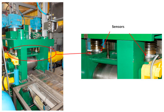 The next step was to conduct the rolling process on a semi-industrial rolling line (Figure 4), the main element of which was the DUO 300 rolling mill (DUO means two rolls rolling mill with roll diameter 300 mm). The rolling line is equipped with the measuring device of the rolling mill that enables the measurement of energy and strength parameters of the rolling process. The measurement was made directly by the sensors of the rolling force and moment, indirectly on the basis of signals received from frequency converters supplying the driving motors of the upper and lower roll. During the experimental tests, the metal pressure force on the rolls was recorded in the measuring system of the DUO-300 rolling mill, which was measured using two CL21 force transducers with a range of 250 kN, placed between the upper roll bearing cases and the adjusting screws.