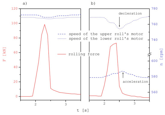 The course of changes in the value of the metal pressure force on the rollers and the rotational speed of the drive motors of the upper and lower rollers, (a) during symmetrical rolling, (b) optimal asymmetrical rolling.