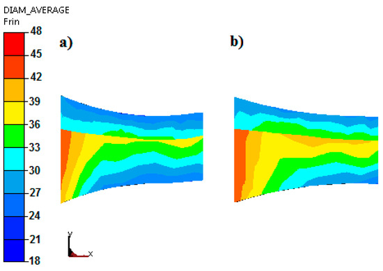 Figure 7 shows the average grain size distributions for the asymmetric rolling process of bimetallic sheet metals X2CrNiMo17-12-2 + 10CrMo9-10 obtained as a result of numerical calculations.