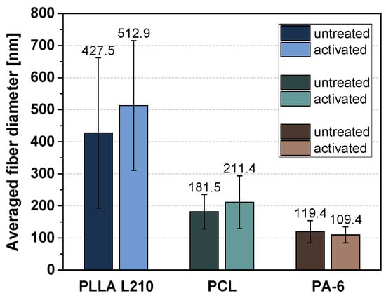 The fiber diameters of the different polymeric nonwovens were determined from 50 measurements each and are shown in absolute terms in Figure 4. Whereas the diversity of the fibers varies the most within PLLA nonwovens, the fiber diameter of untreated and plasma functionalized PLLA L210, PCL and PA-6 nonwovens differ only marginally. This implies that the fiber structure is not changed by the plasma treatment. Additionally, the frequency of the respective fiber diameters for each investigated polymer is presented in Figure S6.