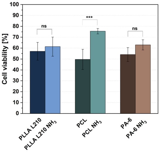 Relative viability of human endothelial EA.hy926 cells on unmodified and NH3-plasma functionalized polymeric nonwovens after 48 h (mean + SD, n = 6, one-way ANOVA, ns = not significant, and *** p < 0.001).