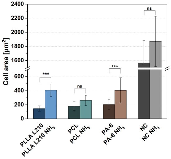 Spreading of human endothelial EA.hy926 cells on untreated and NH3-plasma functionalized polymeric nonwovens after 48 h (mean + SD, n = 40, one-way ANOVA, ns = not significant, and *** p < 0.001).